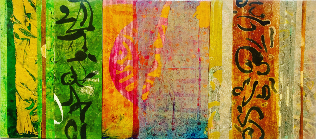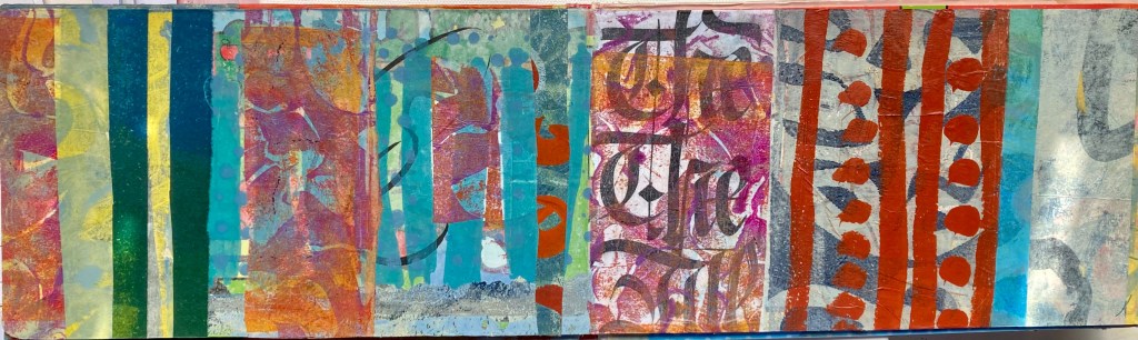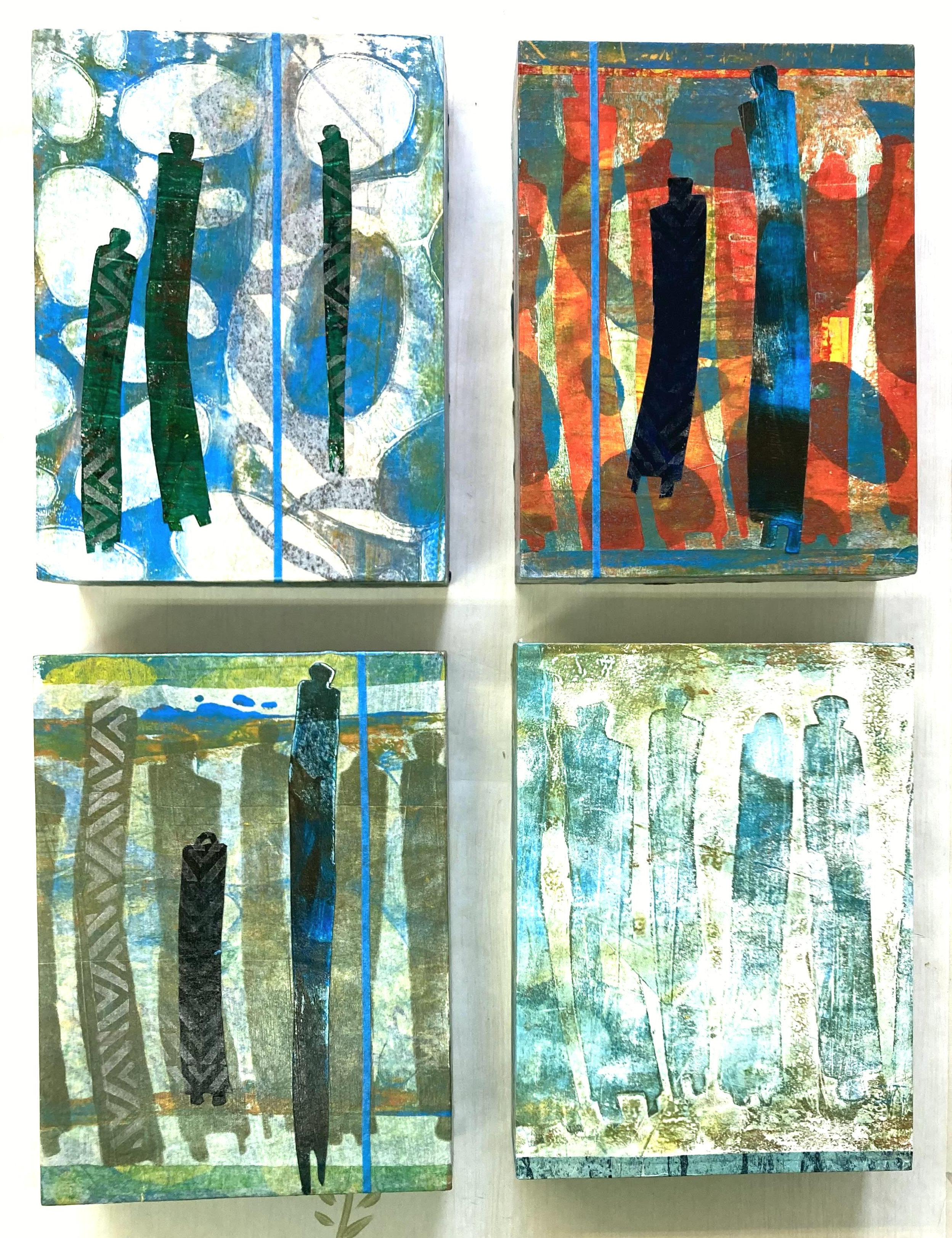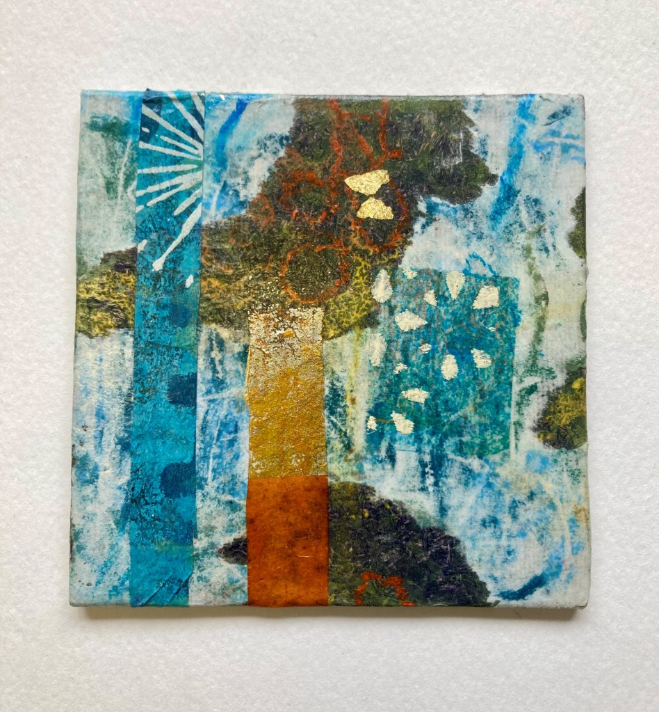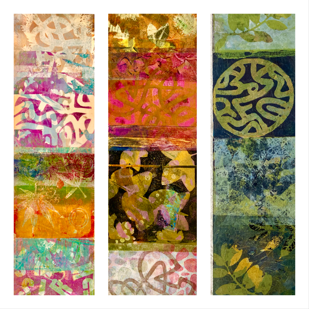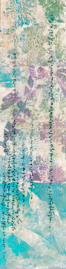 With my collage and monoprints I sometimes combine fragments of expressive writing with abstract forms, symbols, and textures printed from a gelatine plate onto transparent papers, which I mount on wooden panels or upcycled board books.